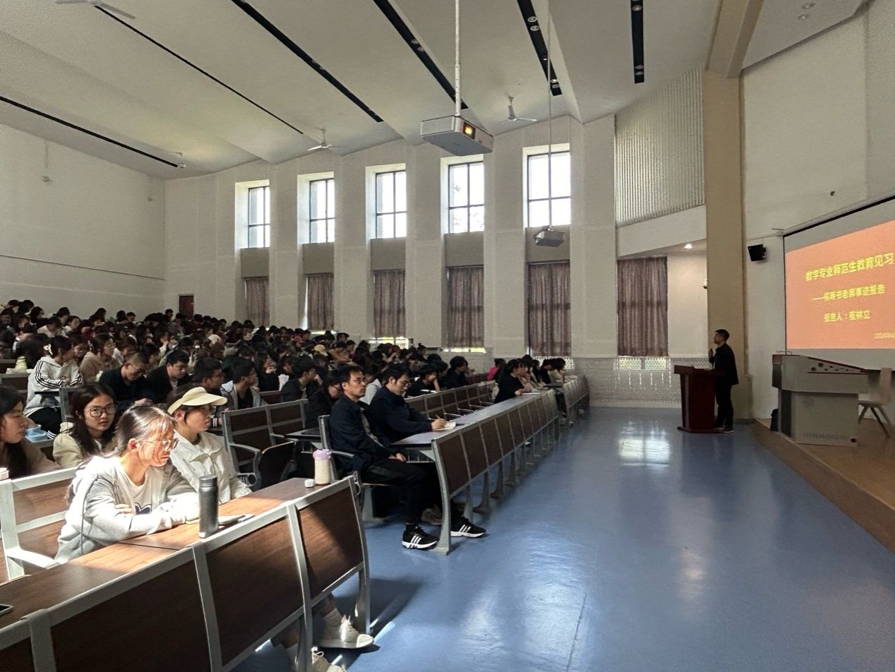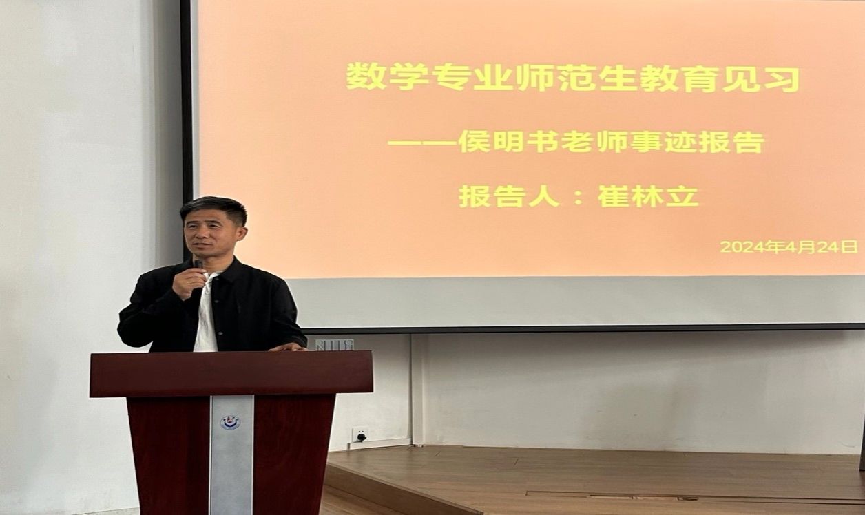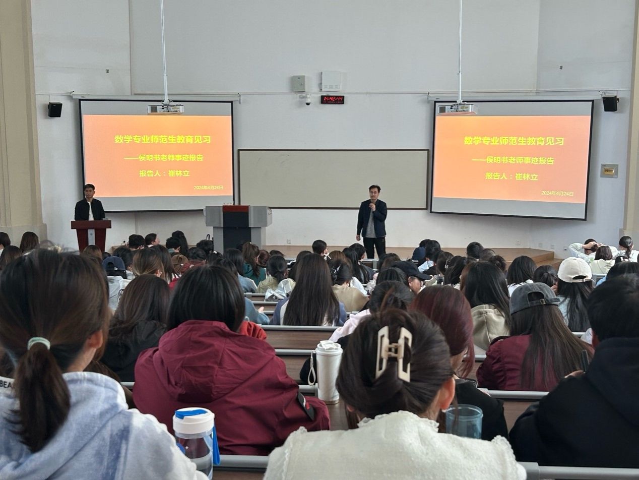 学高为师,身正为范。教书育人的同时闪烁着为人师表的美德和光辉,优良的师德师风是每一位师范生必须具备的基本素质。2024年4月24日,我院举办数学专业师范生教育见习活动,邀请院党委副书记崔林立老师,为2022~2023级数学师范专业本科生作了“侯明书先生事迹报告”的主题讲座,活动由数学系系主任李向有老师安排并主持。