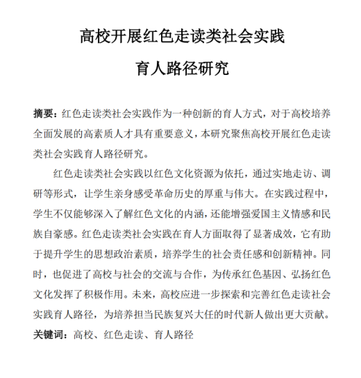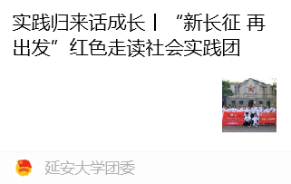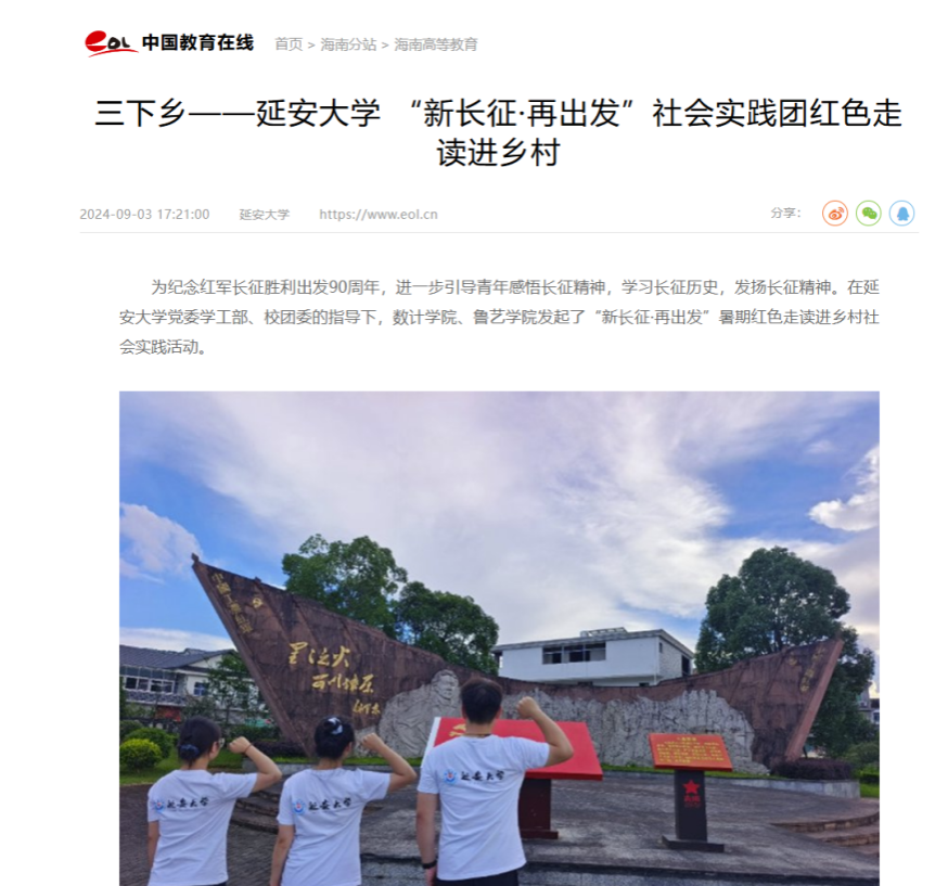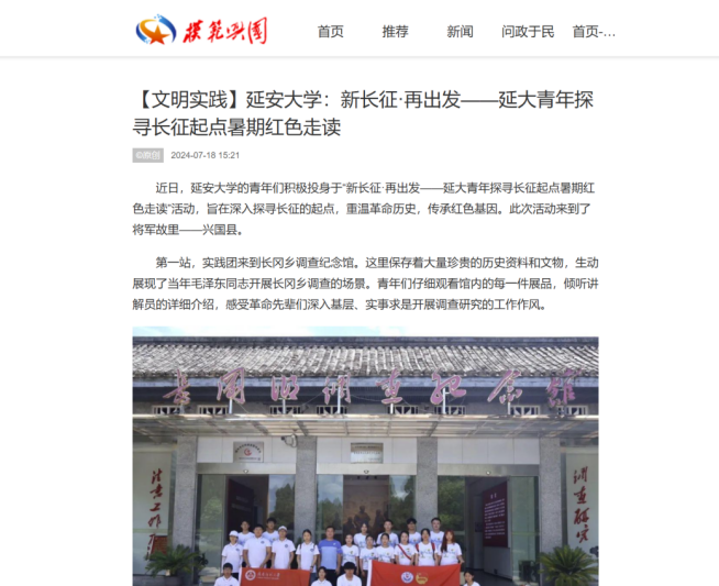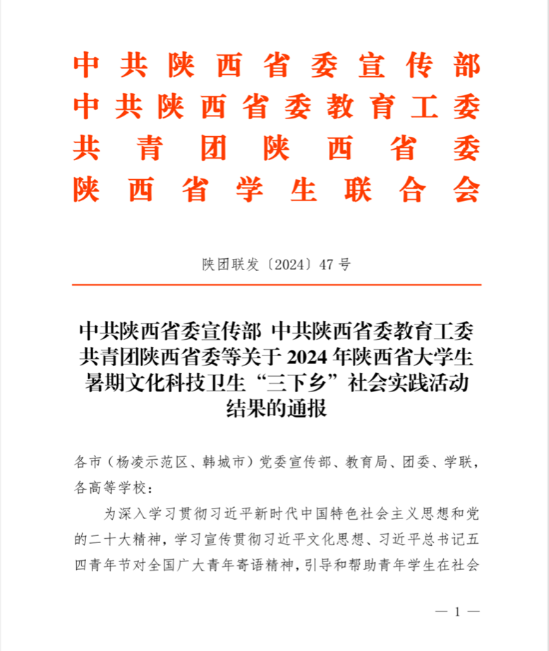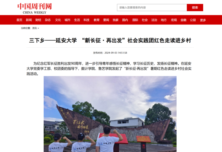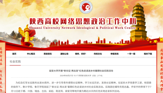 2024年12月5日,中共陕西省委宣传部、中共陕西省委教育工委、共青团陕西省委、陕西省学生联合会组织的2024年陕西省大学生暑期文化科技卫生“三下乡”社会实践活动评选结果公布。延安大学“新长征·再出发”红色走读实践团从全省2.4万支队伍中脱颖而出,进入评选前15名,荣获省级标兵团队称号。