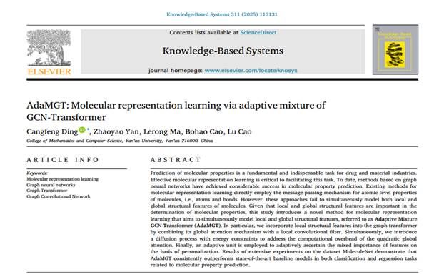 近日,数学与计算机科学学院在人工智能领域取得重要研究进展,研究成果《AdaMGT: Molecular representation learning via adaptive mixture of GCN-Transformer》发表于国际顶级期刊《Knowledge-Based Systems》(论文链接:https://doi.org/10.1016/j.knosys.2025.113131)。《Knowledge-Based Systems》作为我国计算机学会推荐的C类期刊,位列中科院1区TOP期刊。该研究以延安大学为第一完成单位,龙八头号玩家官网研究生延照耀在丁苍峰副教授、马乐荣教授指导下共同完成。