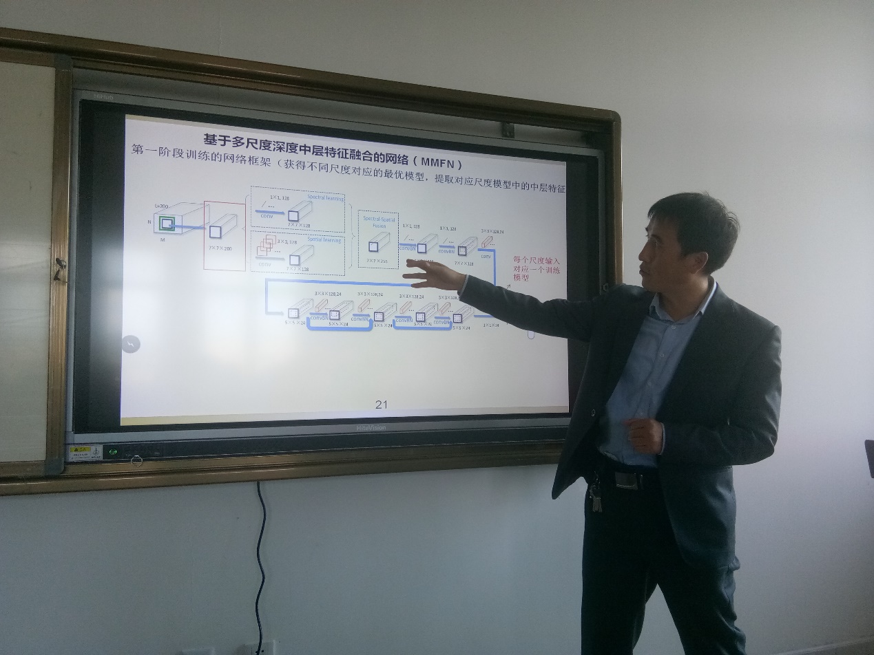 报告会上,李照奎博士介绍了高光谱遥感图像数据的特点、应用潜力和分析难点,围绕高光谱图像空谱信息融合这一关键难点,李照奎博士重点介绍了所在科研团队提出的3种深度学习网络模型,包括基于多尺度空谱融合的深度网络MSS-NET、基于多尺度深度中层特征融合的网络MMFN和深度多层融合密集网络DMFDN,最后对深度学习研究领域有待进一步研究的问题做了总结。