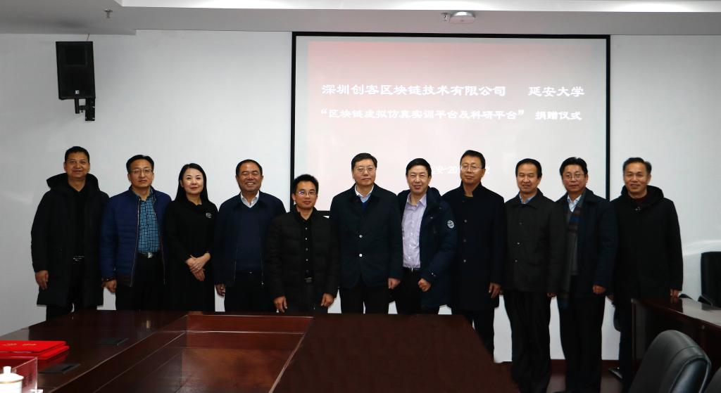 12月12日上午, 深圳创客区块链技术有限公司与延安大学在我校行政楼六楼举行了“区块链虚拟仿真实训平台及科研平台”捐赠仪式。我校党委书记张金锁、党委副书记王顺、深圳创客区块链技术有限公司创始人&CEO蒋忠强总裁、联动优势科技有限公司副总裁兼首席战略官方亚南博士及我校两办、科研处、人事处、对外交流与合作处、龙八头号玩家官网等部门负责人出席了本次捐赠仪式。
