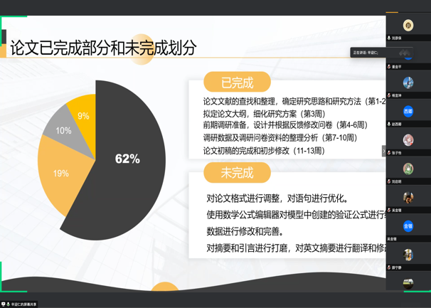 通过本次线上毕业论文(设计)中期抽检汇报,学院进一步掌握了学生的论文(设计)进展情况,并督促学生在疫情期间严格要求自己,按照学校及学院要求顺利完成毕业论文(设计)。