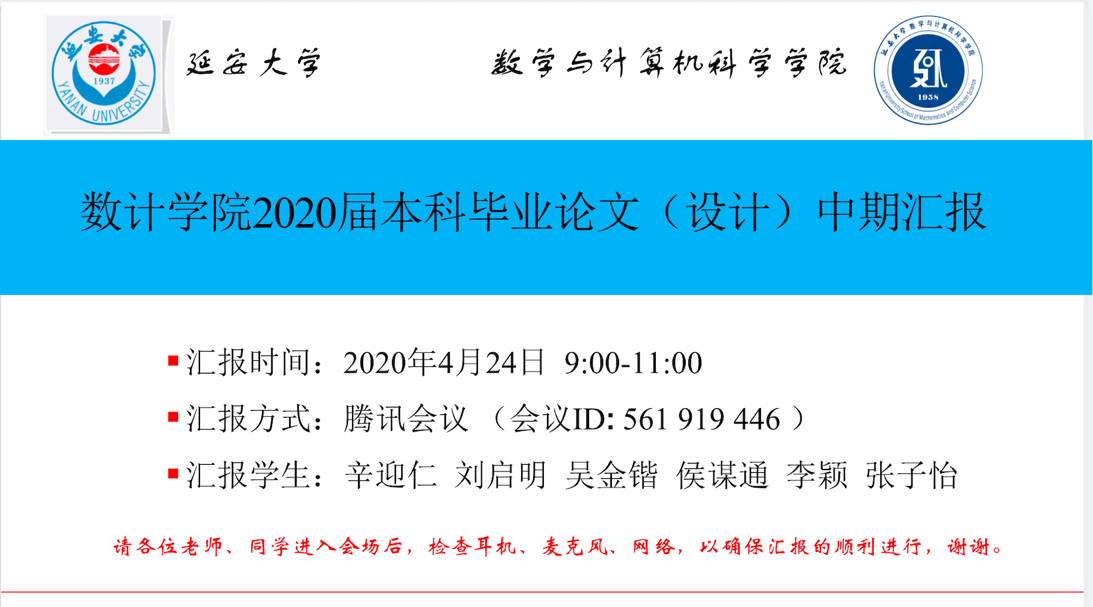 按照学校教务处《头号玩家娱乐app官网开展2020届本科毕业论文(设计)中期检查的通知》要求, 2020年4月24日上午,我院利用腾讯会议平台组织开展了2020届本科毕业论文(设计)中期检查汇报工作,检查组成员包括学院教学副院长姜金平、指导教师刘彦保、赵西卿、薛宁静、任芳玲、杨宜坤和教学秘书王金妮。