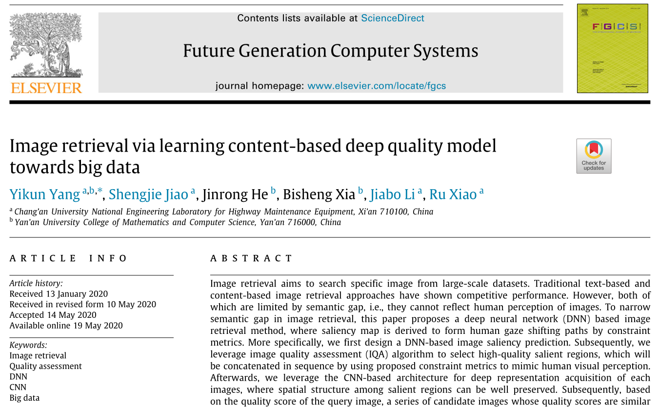 由龙八头号玩家官网青年教师杨宜坤、何进荣等博士合作撰写的论文《Image retrieval via learning content-based deep quality model towards big data》,已在国际重要期刊《Future Generation Computer Systems》发表。该论文报告了龙八头号玩家官网大数据与人工智能研究团队在基于内容的图像检索方面取得的新进展,为了解决视觉信息感知与表达中的语义鸿沟问题,该团队提出了一种基于深度质量模型的图像内容检测方法。该方法基于查询图像的质量评分,可以快速检索出与该质量评分相似的候选图像,并采用距离度量更精细地对候选图像进行排序。