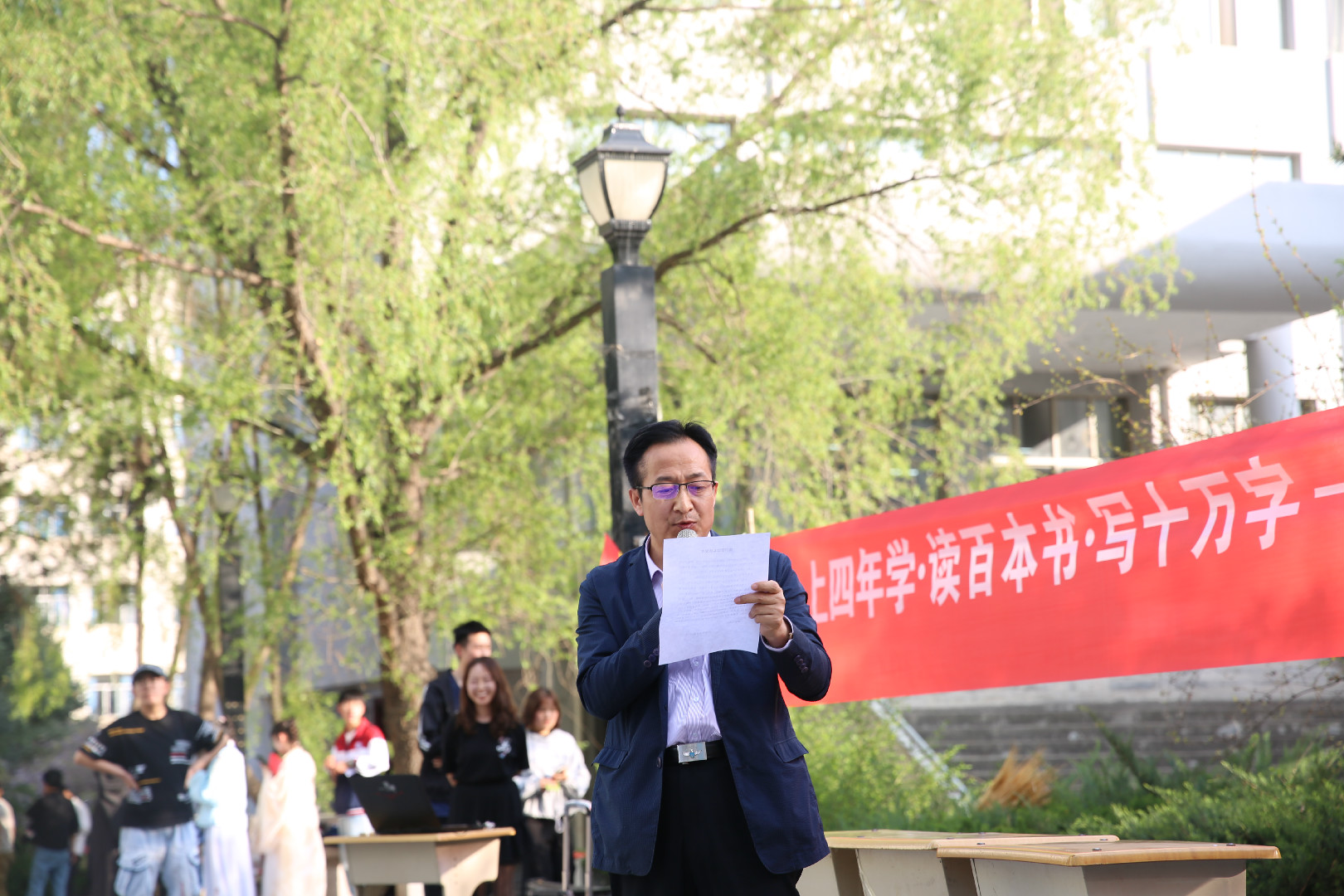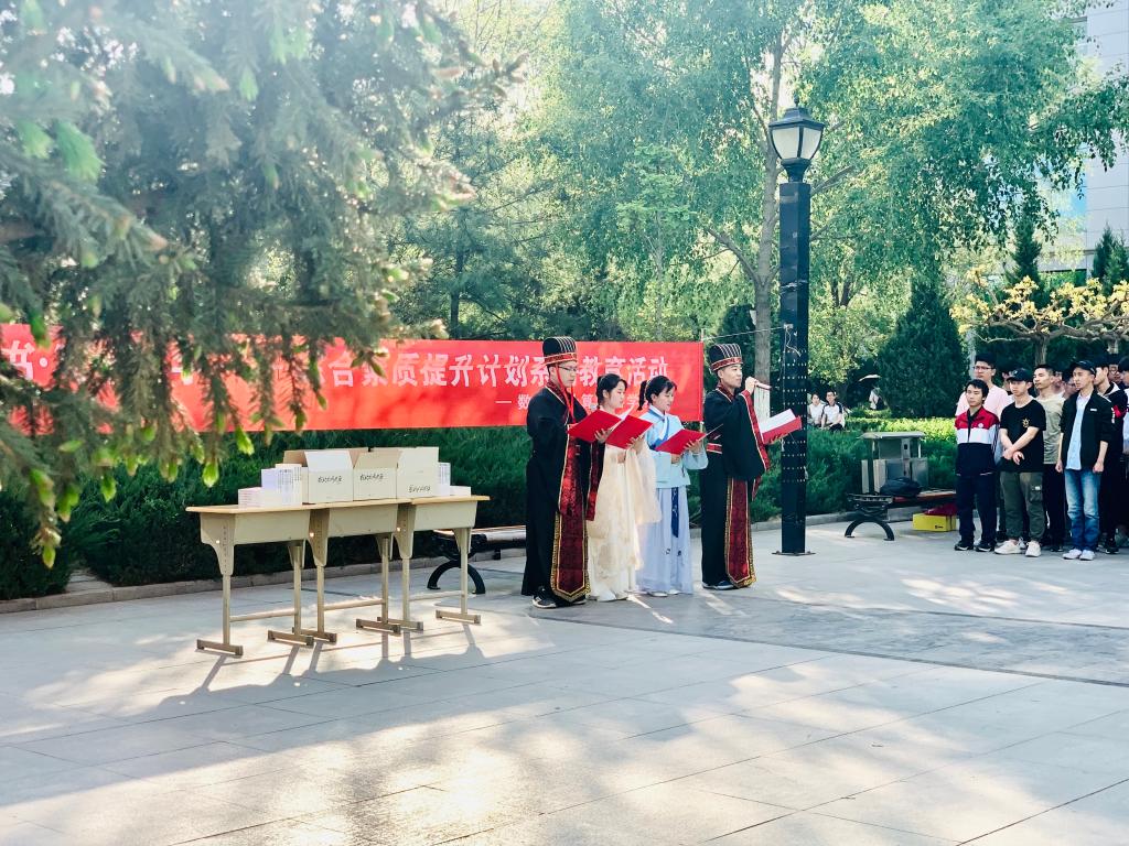 为响应世界读书日,大力推行我院明德工程系列教育活动,2019年4月23日下午,我院在先锋广场举行了 “上四年学•读百本书•写十万字”明德工程综合素质提升计划启动仪式。参加本次活动的有龙八头号玩家官网党委书记高启荣老师、辅导员张慧钧老师以及软件18、信息18班全体学生。