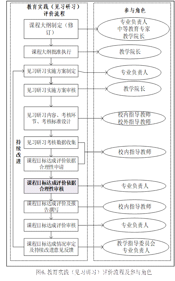 课程评价小组由任课教师、课程负责人、专业负责人、本科教学指导委员会和教学督导组成,其中教学督导负责课程档案材料审核和教学过程质量监控,不直接参与课程目标达成情况评价。根据理论类课(包括企业实训课、实验课)、课程设计、专业见习实习、教育实践(见习实习研习)、毕业论文(设计)不同教学环节,制定不同的评价流程和参与角色。图1所示为理论类课(包括企业实训课、实验课)评价流程和参与角色,图2为课程设计/综合课程设计评价流程和参与角色,图3给出专业见习实习评价流程和参与角色,图4为毕业论文(设计)评价流程和参与角色,图5是教育实践(实习)的评价流程和参与角色,图6给出教育实践(见习研习)的评价流程和参与角色。