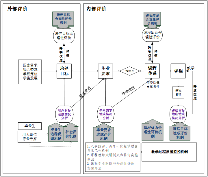 外部评价聚焦培养目标,包括培养目标合理性评价和培养目标达成评价机制,其中培养目标达成评价机制涉及毕业生跟踪反馈机制和社会评价机制。其中毕业生跟踪反馈机制和社会评价机制为培养目标达成评价提供有效数据支撑。