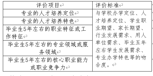 培养目标合理性评价内容包括社会发展需求、国家政策、行业需求、学校定位、专业特色、专业办学条件、学生发展需求和家长期望等。其评价项目涵盖专业人才培养定位、专业的人才培养特色、毕业生5年左右的职业特征或工作特征、毕业生5年左右的专业领域或服务领域、毕业生5年左右的核心职业能力或职业竞争力。于标准见表1。